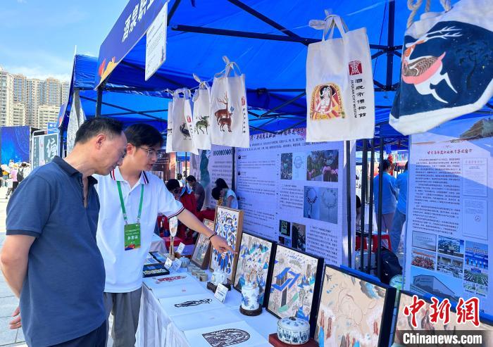 7月14日,酒泉職業(yè)技術(shù)學(xué)院學(xué)生王皓向觀眾介紹敦煌文創(chuàng)作品。中新社記者 丁思 攝