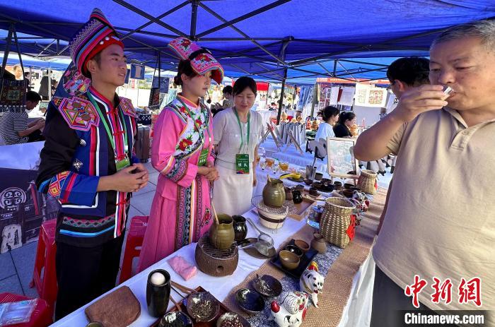 7月14日,甘肅省第二屆“黃炎培杯”中華職業(yè)教育非遺創(chuàng)新大賽在蘭州舉行。圖為身著民族服飾的學(xué)生向觀眾介紹當(dāng)?shù)靥厣嬍澄幕?。中新社記?丁思 攝