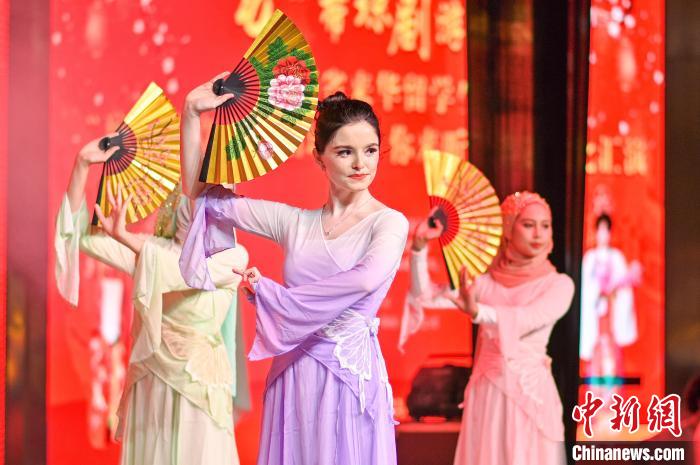 1月22日晚,海南省來華留學生“瓊韻華章之瓦唱瓊劇、你來聽”非遺匯演在??谂e行,外國留學生表演折扇舞。 肖若洋 攝