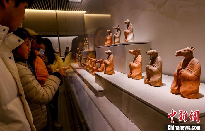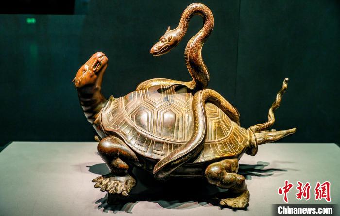 1月21日,湖北省博物館展出的明代鎏金銅玄武,奇特造型,吸引觀眾觀賞。中新社記者 張暢 攝 “龜背上有精美的龜甲紋,蛇身遍布鱗紋,極為細(xì)致,體現(xiàn)了中國(guó)古代高超的鑄造技術(shù)水平。蛇象征生殖和繁衍,龜象征長(zhǎng)壽?!绷_恰介紹,蛇在祭祀活動(dòng)中常扮演重要角色,古人將它裝飾于青銅器上,以期達(dá)成與自然、神靈的溝通,得到天地的庇佑。 據(jù)介紹,玄武是中國(guó)古代傳說(shuō)中鎮(zhèn)守北方的神獸,往往以龜蛇合體的形象出現(xiàn)。漢代以來(lái),龜蛇作為玄武神的象征受到人們奉祀,后被道教吸收后將其人格化,逐漸成為道教的大神。 展出的十二生肖蛇俑也頗具人氣,不少游客帶著孩子在展臺(tái)前駐足端詳。“生肖首人身的造型栩栩如生,同時(shí)也十分有趣,讓人想進(jìn)步一步了解背后的故事。”在湖北探親的游客楊慧,帶著孩子走進(jìn)博物館,參與尋“蛇”互動(dòng)。
