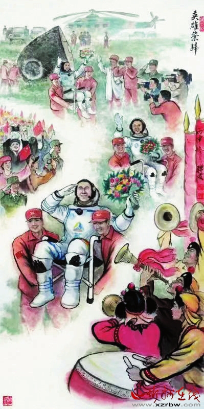 上天攬?jiān)孪矘s歸,歡慶鮮花映日輝。 臥薪嘗膽強(qiáng)國(guó)夢(mèng),任馳宇宙斗芳菲。 俺是人民子弟兵