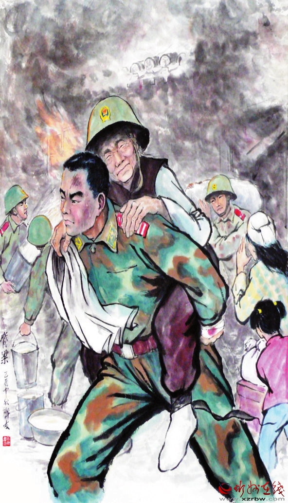 不負(fù)人民養(yǎng)育恩,熊熊烈火見真情。 和平戰(zhàn)事同聽喚,血肉長(zhǎng)城更堅(jiān)固。 無臂繡娘