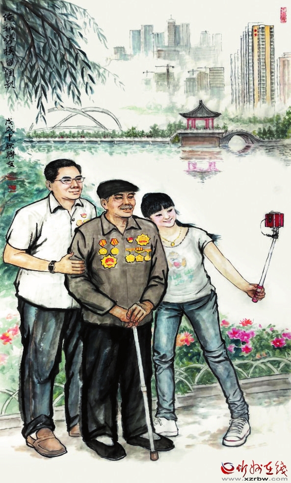 身殘志堅(jiān)忘失聰,輕盈舞步幾年功。 觀音震撼人生美,纖手飄飄繪彩虹。 俺和勞模留個(gè)影