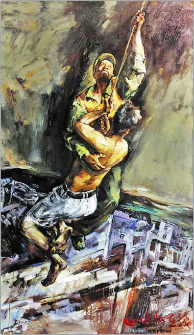 作品《空中救援》中,觀者首先感受到的就是難度。主題表現(xiàn)的事件難度和畫面表現(xiàn)處理的難度交織在一起,讓我們在驚險、焦急的心理壓力下感受到生命的脆弱??罩芯仍闪松奈ㄒ煌ǖ馈>仍瑯邮请U象環(huán)生、驚心動魄。從畫面處理技巧上是一種挑戰(zhàn),天空與地面的透視關系,動感與靜態(tài)的對立統(tǒng)一,那種命懸一線的緊迫感對心理的沖擊力,通過大刀闊斧的刮刀、筆觸處理,和蒼涼緊迫的色調(diào)關系,準確地展示了主題思想,大膽省略了一些不必要的細節(jié)描寫。用大筆觸、大色塊表現(xiàn)背景的壓抑和險峻,救援主體成為沖破這一重壓的希望之色。沒有去刻意刻畫天與地的真實場景,簡潔概括但不呆板空洞,這種果斷的駕馭,是續(xù)鶴賢真實實力的體現(xiàn)。 邢晨聲 文