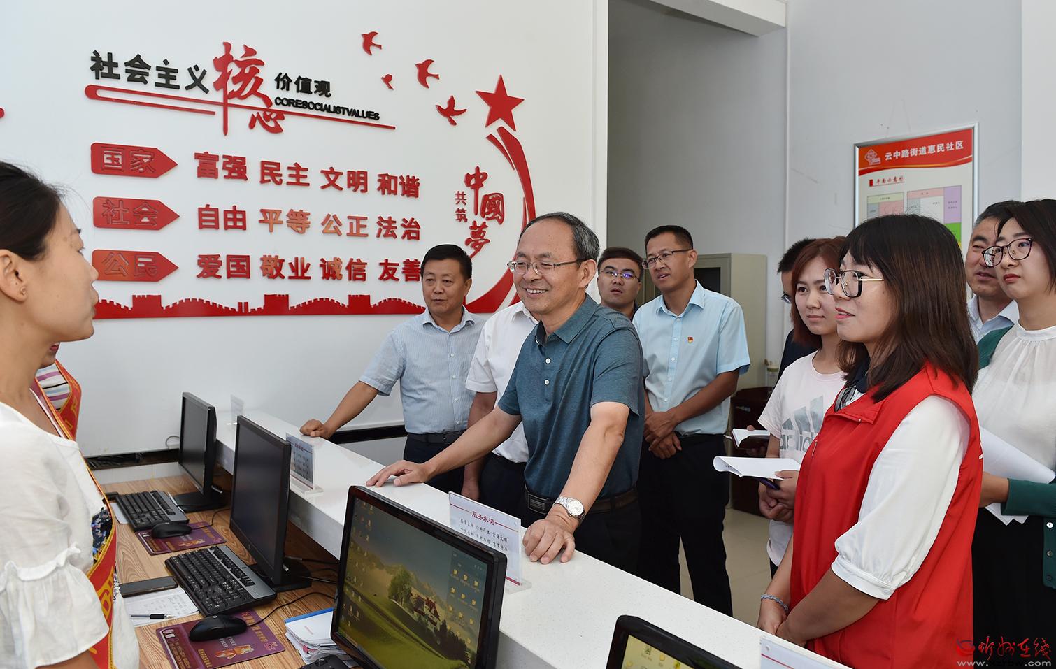 惠民社區(qū)創(chuàng)文氣氛濃厚,墻上張貼著創(chuàng)文展板,隨處可見溫馨的提示,志愿者隨時提供服務(wù)。鄭連生檢查了社區(qū)綜合文化服務(wù)中心,向工作人員詢問服務(wù)中心的功能和作用,并查看了社區(qū)創(chuàng)文資料。他強調(diào),要切實發(fā)揮好綜合文化服務(wù)中心在文化宣傳、黨員教育、科普教育、普法教育、市民教育、家長學(xué)校、道德講堂等方面的作用,形成制度,制定活動計劃,按期開展活動,促進群眾素能的不斷提升。