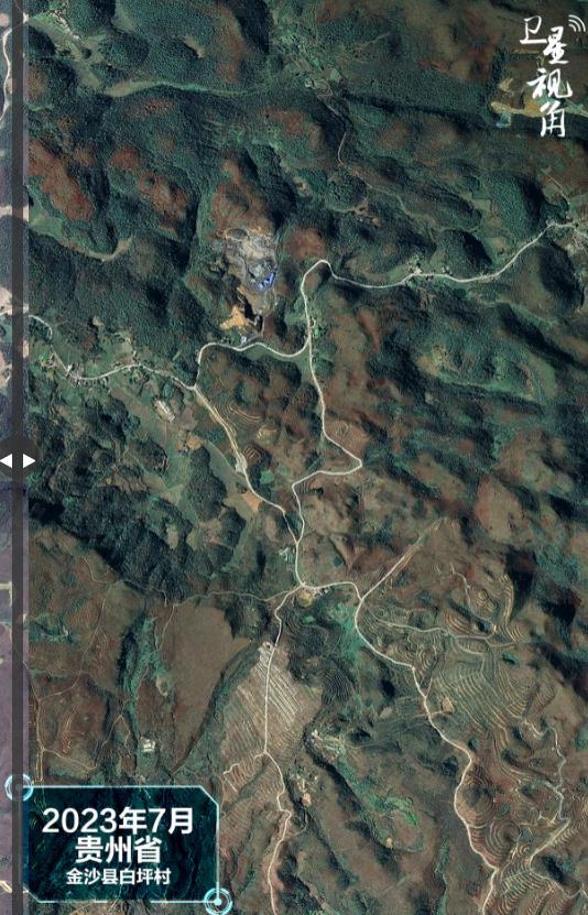↑點擊圖左側(cè)白色箭頭標識左右滑動看變化。2023年跟2015年相比,貴州畢節(jié)金沙縣白坪村周邊山體植被更豐富,森林覆蓋率提高。