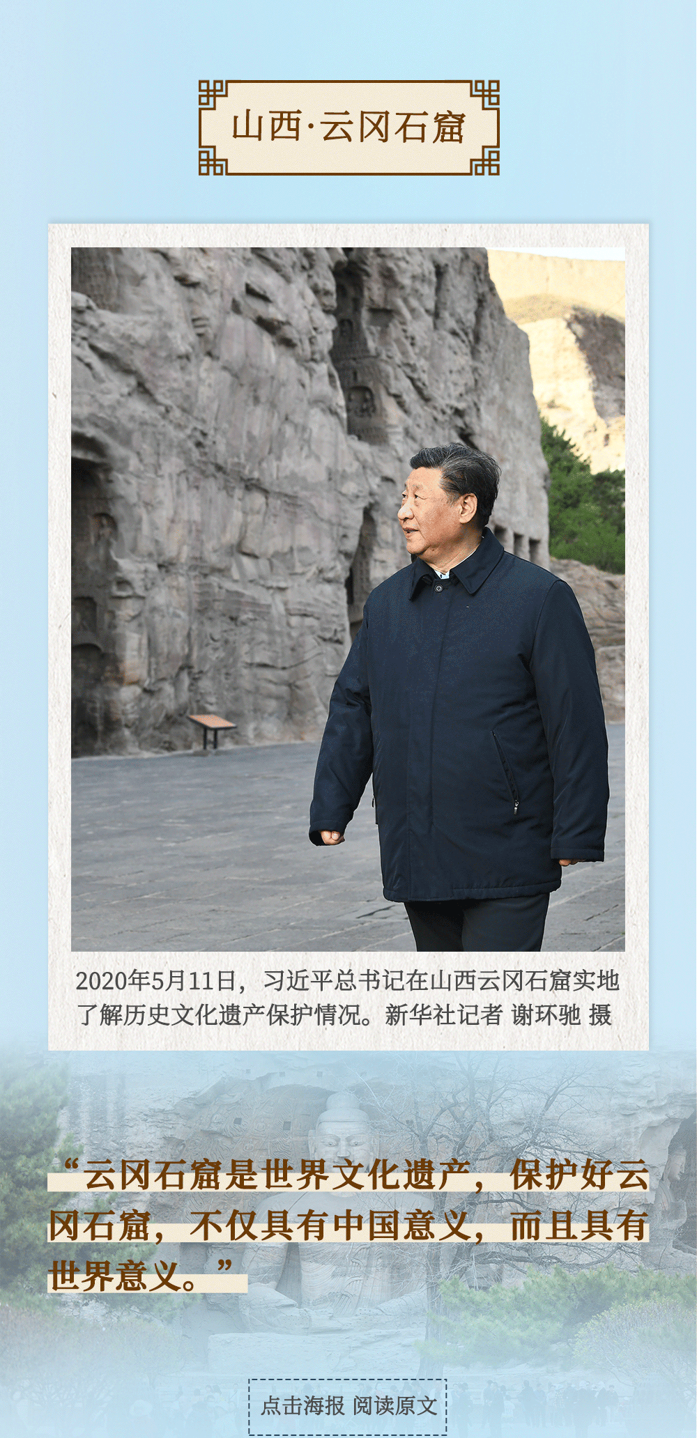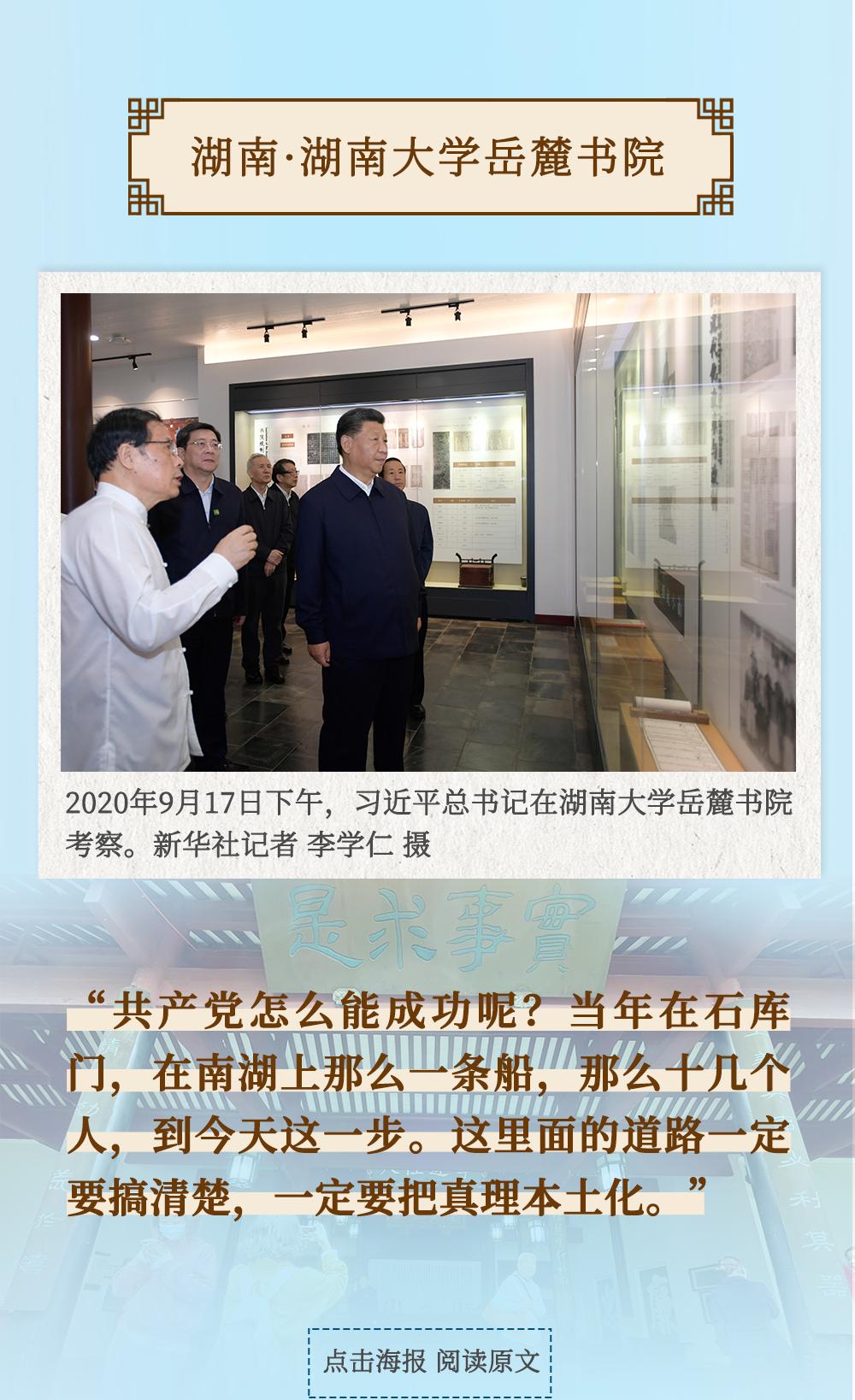 從四川三蘇祠到河南殷墟遺址,從山東孔府、孔子研究院到湖南大學(xué)岳麓書院,從甘肅嘉峪關(guān)關(guān)城到福建朱熹園,從山西云岡石窟到廣東潮州古城……考察文化遺產(chǎn)、探尋文明根脈,帶著深厚的歷史感,習(xí)近平總書記的“文化足跡”遍及全國(guó)。