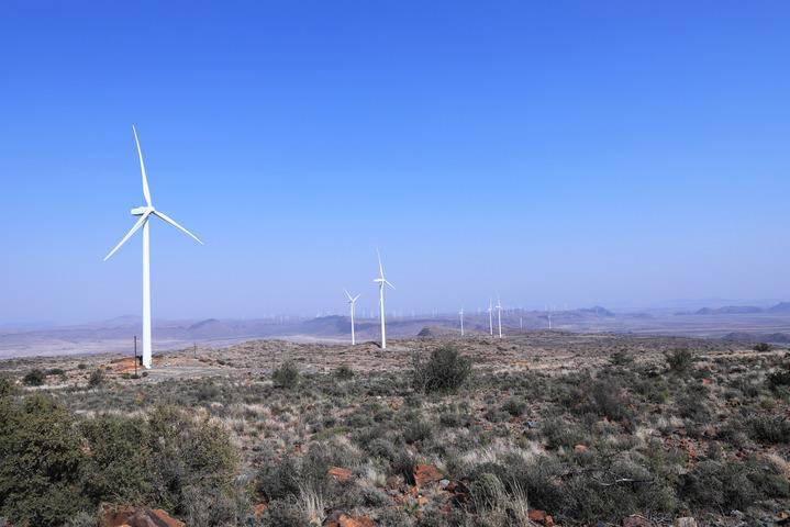 這是8月10日在南非北開普省德阿鎮(zhèn)拍攝的中國(guó)國(guó)家能源集團(tuán)龍?jiān)措娏δ戏枪具\(yùn)營(yíng)的德阿風(fēng)電項(xiàng)目風(fēng)機(jī)。新華社記者 董江輝 攝