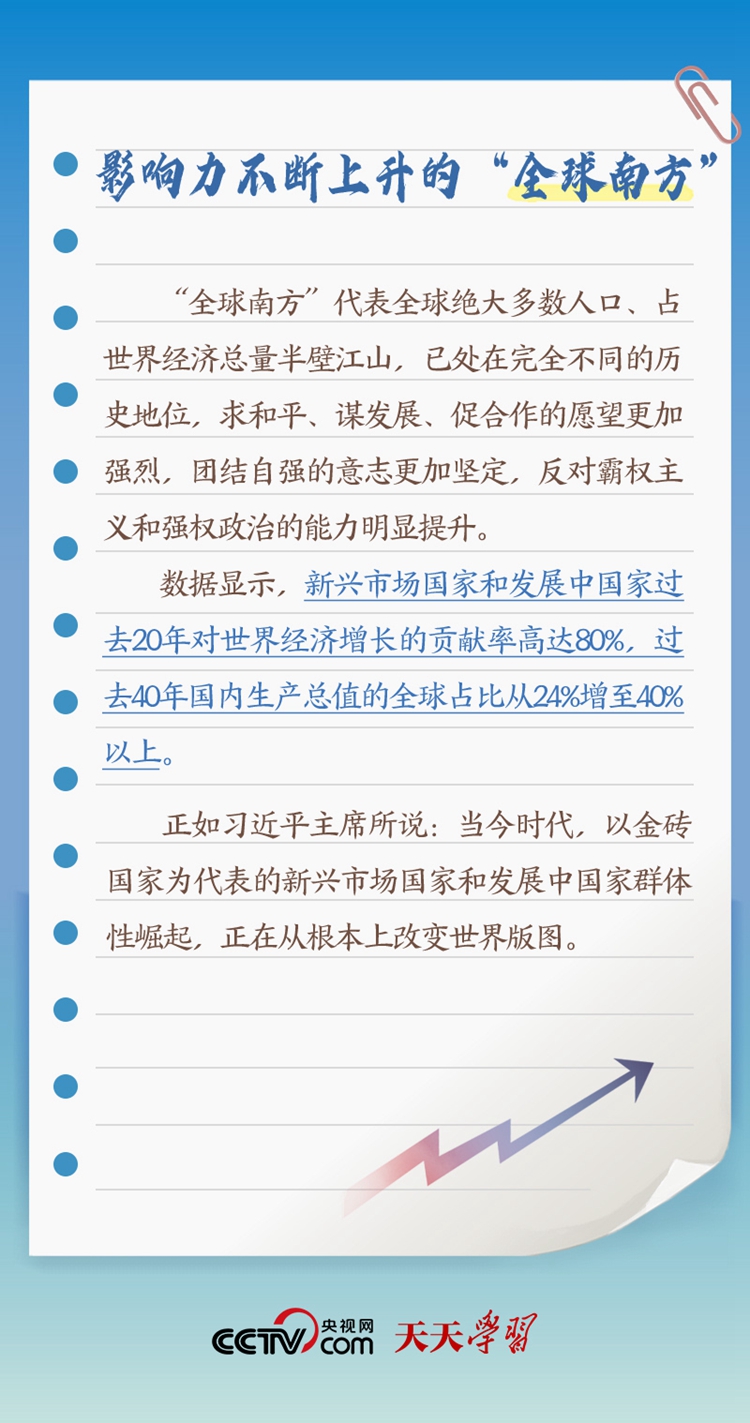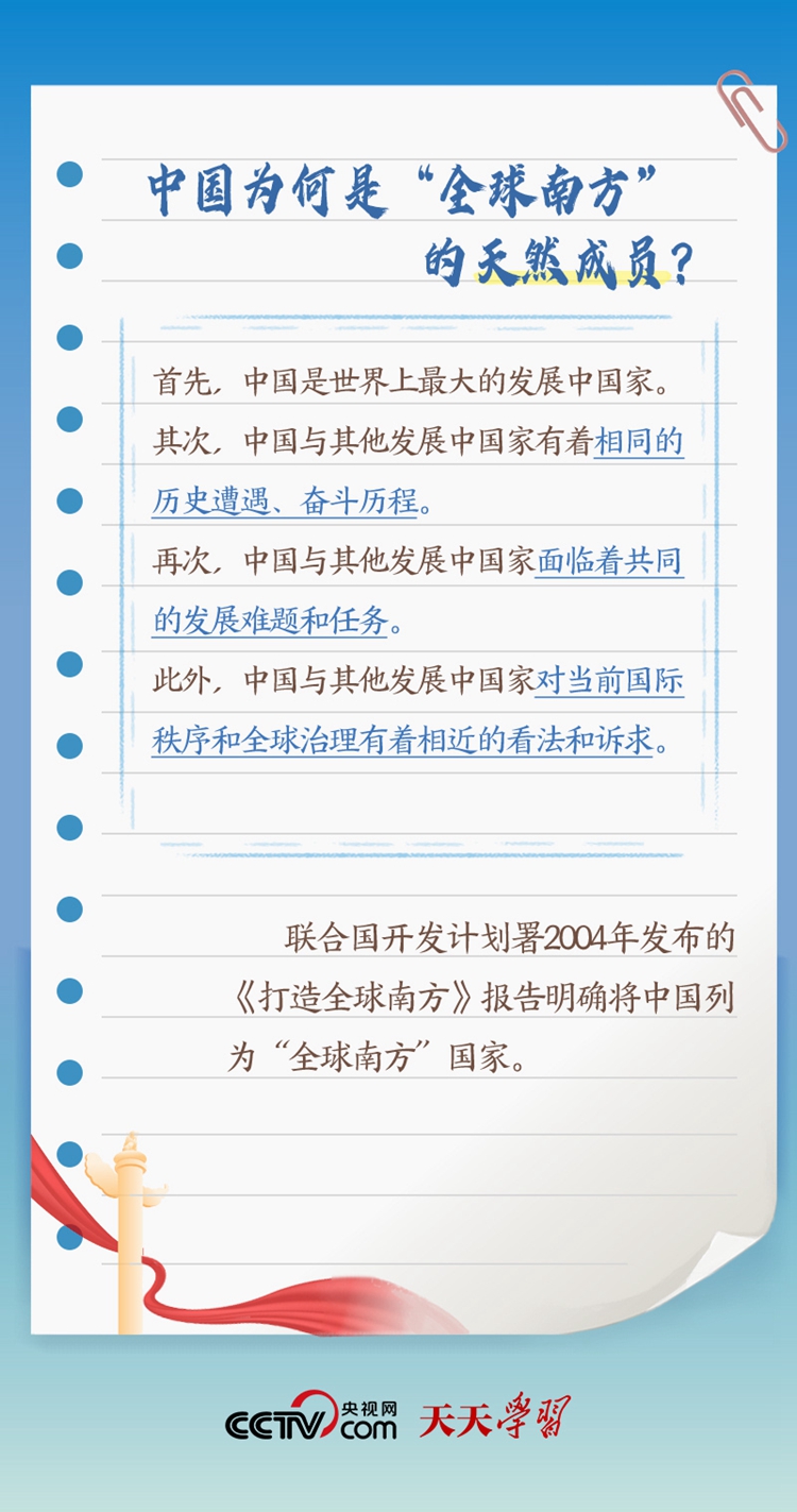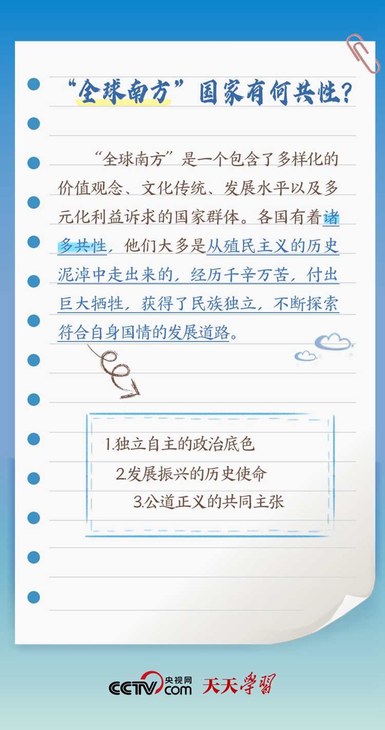 天天學(xué)習(xí)“作為發(fā)展中國家、‘全球南方’的一員,中國始終同其他發(fā)展中國家同呼吸、共命運(yùn)”;“中南作為‘全球南方’天然成員,更要團(tuán)結(jié)一致,共同呼吁擴(kuò)大發(fā)展中國家在國際事務(wù)中的話語權(quán)和影響力”;“提升‘全球南方’國家在全球治理中的代表性和發(fā)言權(quán)”。 此次出訪,習(xí)近平主席在向約翰內(nèi)斯堡金磚國家工商論壇閉幕式發(fā)表致辭、同南非總統(tǒng)拉馬福薩共同會(huì)見記者等場合均提及“全球南方”。什么是“全球南方”?“全球南方”國家有何共性?中國為何是“全球南方”的天然成員?跟著央視網(wǎng)《天天學(xué)習(xí)》一起了解。