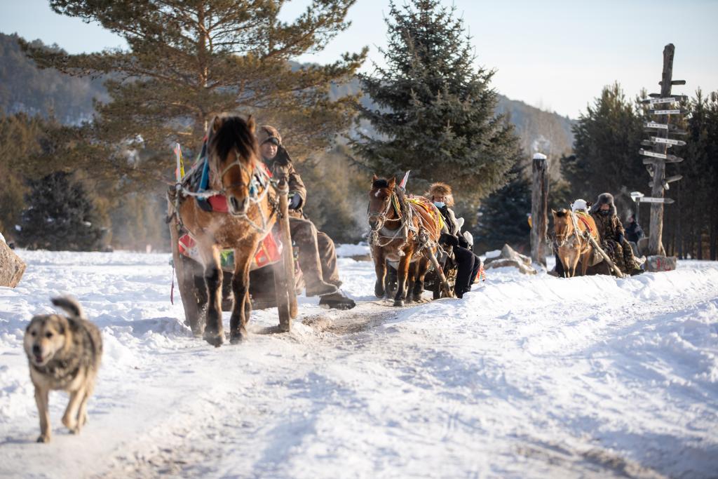 1月10日,在漠河市北極村,游客乘坐馬拉爬犁。新華社記者 張濤 攝