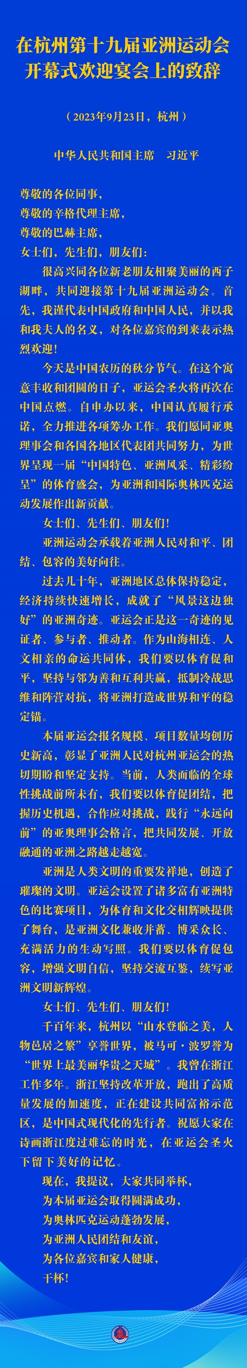 很高興同各位新老朋友相聚美麗的西子湖畔,共同迎接第十九屆亞洲運(yùn)動(dòng)會(huì)。首先,我謹(jǐn)代表中國政府和中國人民,并以我和我夫人的名義,對(duì)各位嘉賓的到來表示熱烈歡迎!