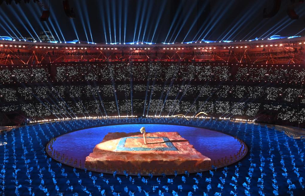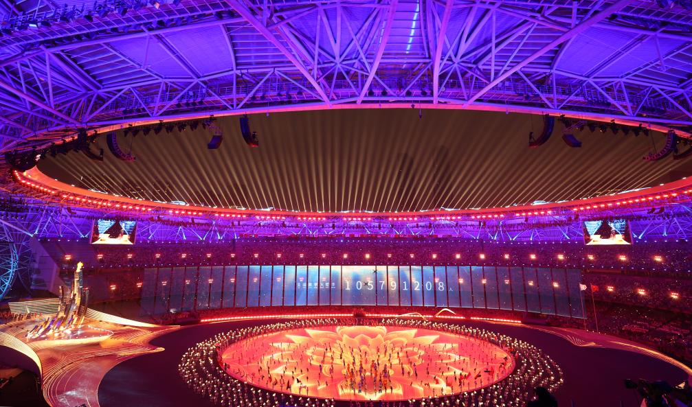 這是9月23日在開幕式上拍攝的演出。新華社記者 楊磊 攝 文明之光閃耀亞細(xì)亞 “10、9、8、7……”,伴隨19座“水玉琮”擊出鏗鏘鼓聲,潮水漸次漾開。以水為禮,擊鼓迎賓,在全場觀眾的倒數(shù)聲中,本屆亞運(yùn)會(huì)會(huì)徽“潮涌”浮現(xiàn)。