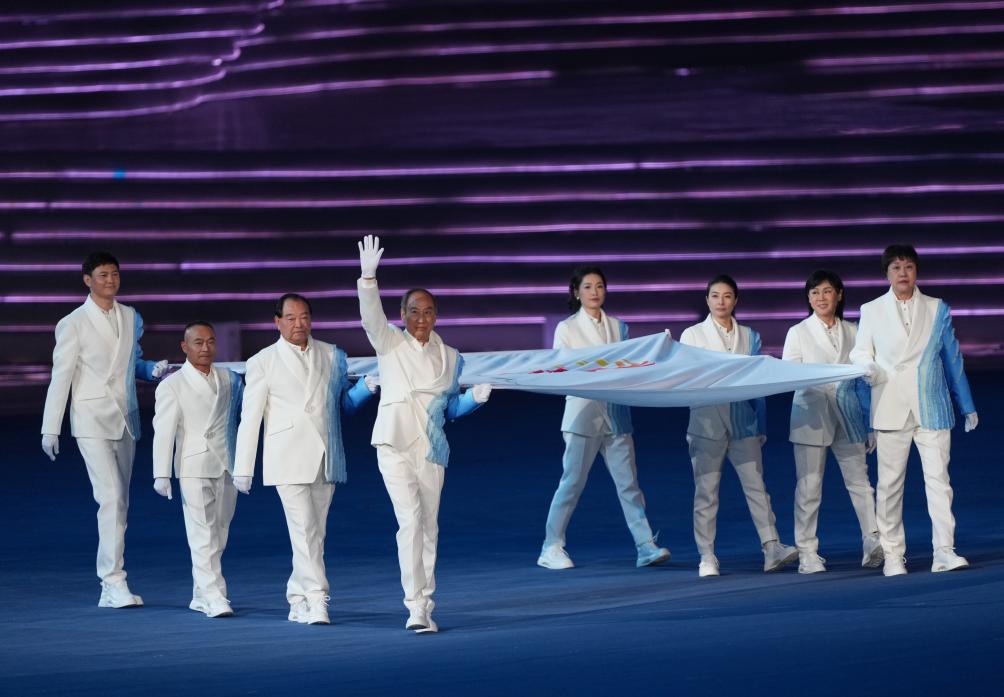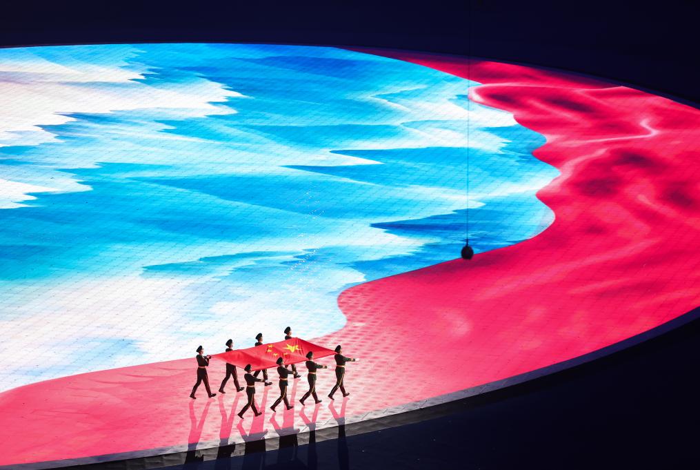 9月23日,中華人民共和國國旗入場。新華社記者 潘昱龍 攝 伴著雄壯的《義勇軍進(jìn)行曲》,五星紅旗緩緩升起。 20時(shí)09分,地屏上勾勒出團(tuán)扇造型,“梅蘭竹菊”主題之窗開啟,不同國家和地區(qū)的運(yùn)動(dòng)員紛至而來。中國以真摯的熱情開門迎客,定格下四海賓朋如約而至的“杭州時(shí)刻”。 氣勢(shì)宏大的《歌唱祖國》奏響,包括886名運(yùn)動(dòng)員在內(nèi)的中國體育代表團(tuán)最后入場,全場一片歡騰,掌聲歡呼聲此起彼伏。本屆亞運(yùn)會(huì)上,中國健兒將參加38個(gè)大項(xiàng)、407個(gè)小項(xiàng)的角逐。 從1974年在伊朗首都德黑蘭首次參加亞運(yùn)會(huì),到亞運(yùn)金牌數(shù)累計(jì)破千,近50年來,中國全社會(huì)重視體育、支持體育、參與體育的氛圍愈加濃厚。 光陰荏苒,深情如一。 從北京亞運(yùn)會(huì)的熱烈澎湃,到廣州亞運(yùn)會(huì)的時(shí)尚活力,如今的杭州亞運(yùn)會(huì)用酷炫科技表現(xiàn)中華文化,展現(xiàn)出新時(shí)代中國自信自強(qiáng)、蓬勃向上的精神風(fēng)貌。 錢塘之潮煥新亞運(yùn)活力 伴隨習(xí)近平主席宣布盛會(huì)開幕,“數(shù)字焰火”流光溢彩,全場觀眾齊聲高呼,為亞運(yùn)釋放最熾烈的熱情。 亞奧理事會(huì)全部45個(gè)成員齊聚本屆亞運(yùn)賽場,參賽運(yùn)動(dòng)員人數(shù)超過12000名,創(chuàng)歷屆之最;比賽項(xiàng)目既有田徑、游泳等奧運(yùn)大項(xiàng),也有武術(shù)、藤球、板球、克柔術(shù)等代表亞洲不同地域體育文化的特色項(xiàng)目,還有首次成為亞運(yùn)會(huì)正式項(xiàng)目的霹靂舞等。多元包容,青春洋溢,有著70余年歷史的亞洲運(yùn)動(dòng)會(huì)煥發(fā)出全新活力。 “非常高興亞運(yùn)會(huì)能夠把奧運(yùn)會(huì)新項(xiàng)目納入其中?!鼻皝沓鱿_幕式的國際奧委會(huì)主席托馬斯·巴赫相信,杭州亞運(yùn)會(huì)將成功精彩,促進(jìn)亞洲的團(tuán)結(jié)與友誼。 音樂響起,8名中國運(yùn)動(dòng)員、教練員代表共執(zhí)亞奧理事會(huì)會(huì)旗入場。伴隨著亞奧理事會(huì)會(huì)歌,會(huì)旗緩緩上升,在杭州高高飄揚(yáng)。
