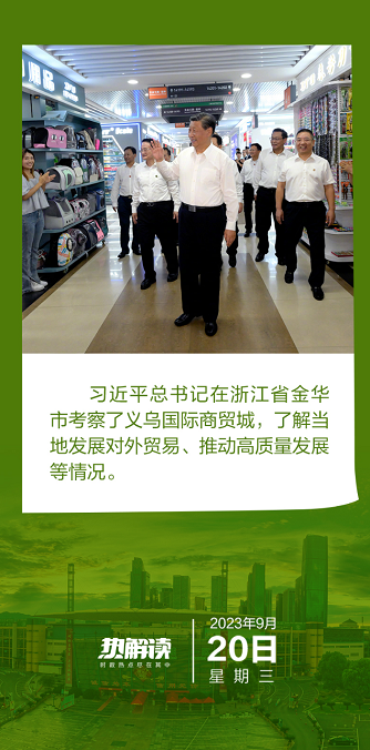 9月20日,習(xí)近平總書記到浙江考察的第二站,是義烏國(guó)際商貿(mào)城。走進(jìn)這座“買賣全球”的“世界超市”,總書記考察了五金工具配件商鋪、傘鋪等,詳細(xì)了解義烏國(guó)際商貿(mào)城發(fā)展對(duì)外貿(mào)易、推動(dòng)高質(zhì)量發(fā)展等情況,并鼓勵(lì)商戶們:“義烏的小商品、大市場(chǎng),不斷地再造新的輝煌?!?/p>