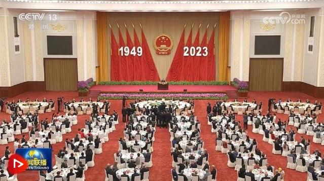 人民大會堂宴會廳華燈璀璨、鮮花綻放,洋溢著喜慶熱烈的節(jié)日氛圍。主席臺上方高懸著莊嚴的國徽,“1949-2023”大字年號在鮮艷的紅旗映襯下格外醒目。
