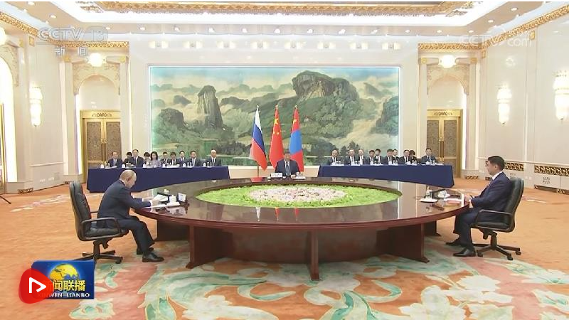 9月2日上午,國家主席習近平同俄羅斯總統(tǒng)普京、蒙古國總統(tǒng)呼日勒蘇赫在北京人民大會堂舉行中俄蒙三國元首第七次會晤。
