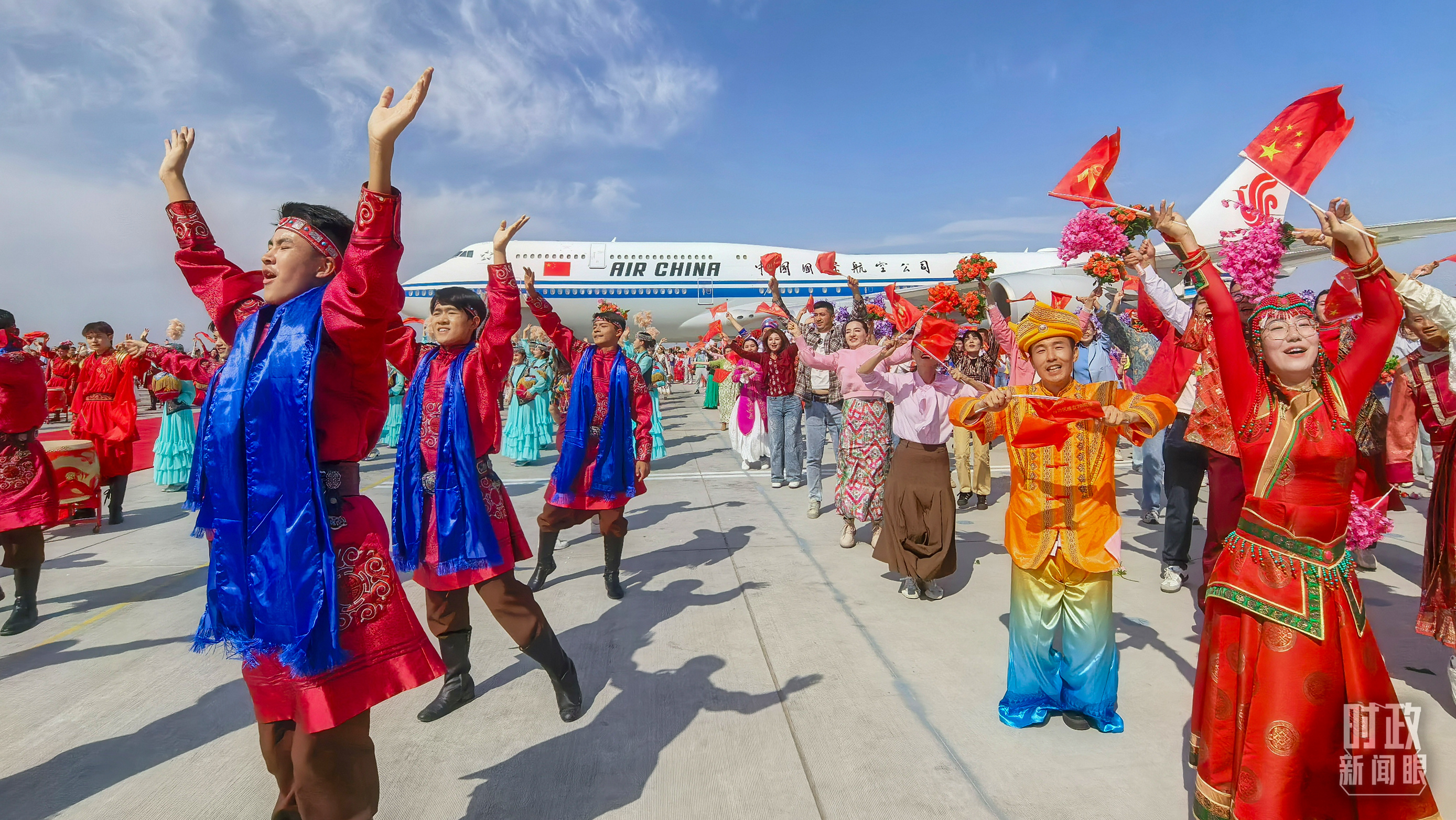 23日下午,烏魯木齊天山國際機(jī)場(chǎng)鼓樂喧天。總書記乘坐的專機(jī)在機(jī)場(chǎng)降落,等候在停機(jī)坪的新疆各族各界群眾熱烈歡呼。