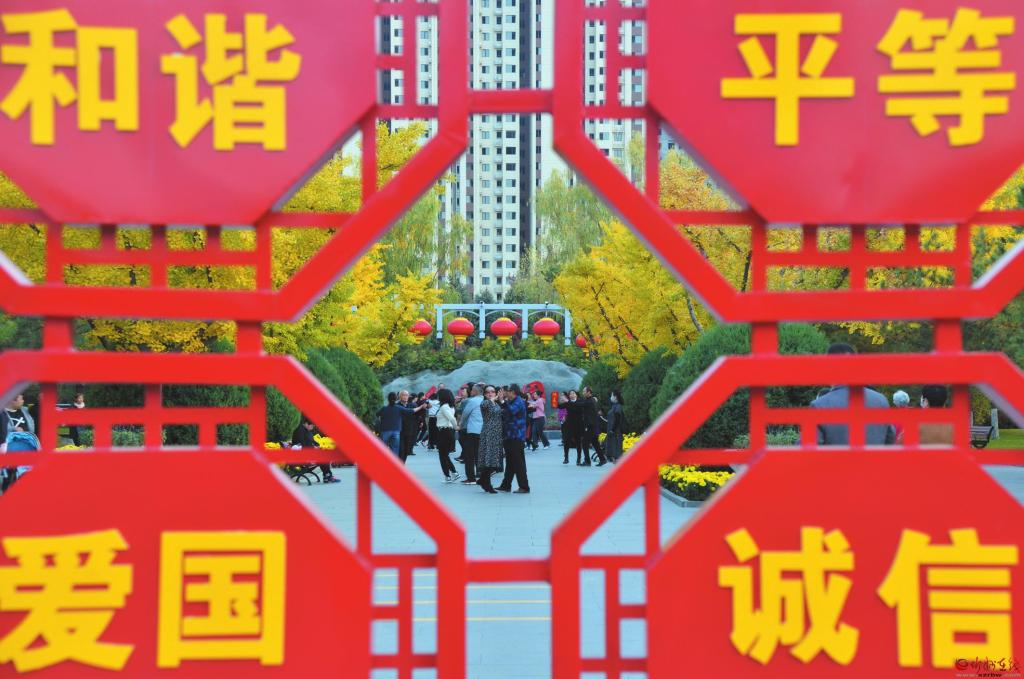 在我市中心城區(qū)的公園、廣場和城市綠地中,以社會主義核心價值觀、文明城市創(chuàng)建、優(yōu)秀傳統(tǒng)文化等為主題的宣傳展板、景觀造型隨處可見,在弘揚傳統(tǒng)文化、傳播城市文明的同時,給市民帶來視覺上的藝術享受,讓游客在游園賞景中受到熏陶。 (張存良 攝)