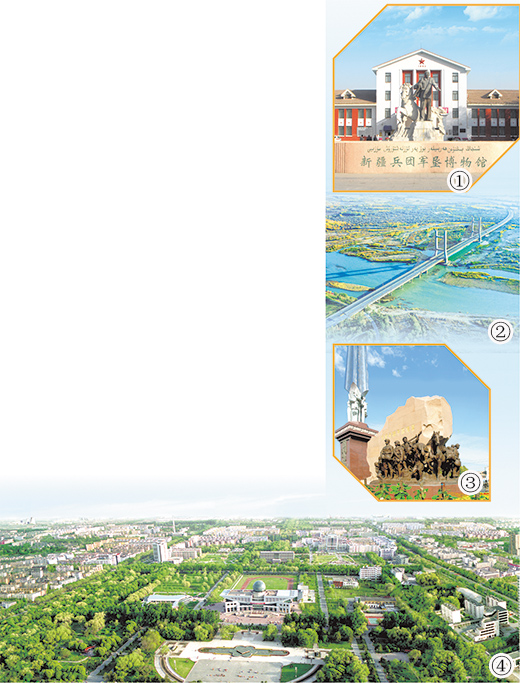 石河子市被譽(yù)為“共和國軍墾第一城”。第一代老軍墾陸振歐回憶當(dāng)時(shí)的情景,仍記憶猶新:“那時(shí)只有車馬店、賣馕的幾戶人家,除了北面蘆葦?shù)兀教幨腔臑└瓯?。”第一代兵團(tuán)人喝鹽堿水、睡“地窩子”,人拉肩扛、挖渠引水、改造葦湖、開墾荒地,在荒無人煙的大漠之邊打造了一座現(xiàn)代化新城。如今,石河子市碧水繞城、綠意盎然、鳥語花香,綠蔭掩映座座現(xiàn)代化廠房。石河子崛起為新疆重要工業(yè)基地,享有“戈壁明珠”的美名。“石河子從一張白紙起家,發(fā)展到現(xiàn)在,靠的就是兵團(tuán)人艱苦奮斗、開拓創(chuàng)新的精神?!标懻駳W感慨地說。