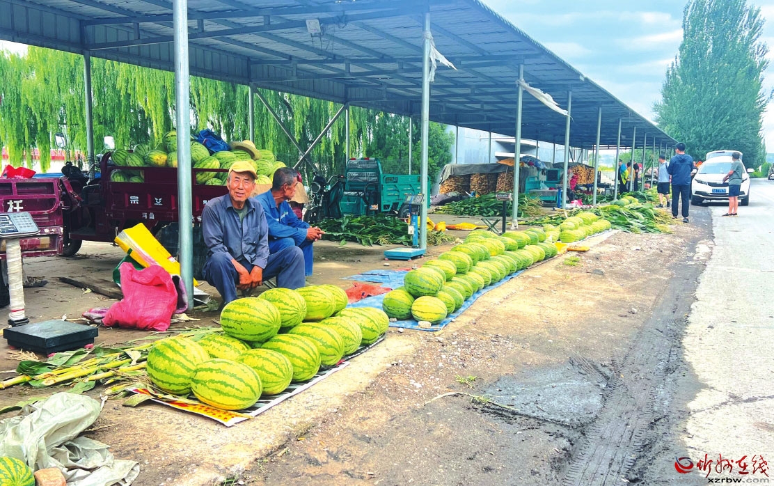 市場(chǎng)有回響,品質(zhì)過(guò)硬銷路旺。在村里的瓜果交易市場(chǎng),75歲的鄔培林?jǐn)偽磺?,一排排個(gè)頭飽滿的西瓜格外顯眼。有著多年種植經(jīng)驗(yàn)的他對(duì)市場(chǎng)行情了如指掌:“西瓜上市半個(gè)多月了,剛開始賣兩元一斤,現(xiàn)在是6角一斤,正在陸續(xù)降價(jià)?!彪m然價(jià)格隨上市時(shí)間有所回落,但西瓜品質(zhì)好不愁銷路。