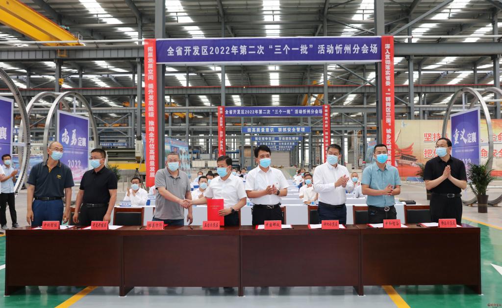 在定襄經(jīng)濟(jì)技術(shù)開發(fā)區(qū)寶航重工有限公司車間,與省主會(huì)場同步,李建國主持舉行了忻州市“簽約一批”代表項(xiàng)目集中簽約活動(dòng)。忻州經(jīng)濟(jì)開發(fā)區(qū)與山西汽運(yùn)集團(tuán)“汽運(yùn)網(wǎng)絡(luò)貨運(yùn)數(shù)字產(chǎn)業(yè)園項(xiàng)目”、原平經(jīng)濟(jì)技術(shù)開發(fā)區(qū)與山西晉海清潔能源有限公司“500MW/1GWh共享儲(chǔ)能電站項(xiàng)目”、繁峙經(jīng)濟(jì)技術(shù)開發(fā)區(qū)與山西華茂智能新材料有限公司“綜合治理提升工程項(xiàng)目”、定襄經(jīng)濟(jì)技術(shù)開發(fā)區(qū)與德?;饘僦破酚邢薰尽澳昙庸?000噸鋼材項(xiàng)目”、靜樂現(xiàn)代農(nóng)業(yè)產(chǎn)業(yè)示范區(qū)與北京中和智谷循環(huán)經(jīng)濟(jì)科技有限公司“200MW農(nóng)牧光儲(chǔ)一體化項(xiàng)目”、神池現(xiàn)代農(nóng)業(yè)產(chǎn)業(yè)示范區(qū)與中國郵政集團(tuán)“郵件處理中心項(xiàng)目”、五臺(tái)現(xiàn)代農(nóng)業(yè)產(chǎn)業(yè)示范區(qū)與雄縣方濟(jì)商貿(mào)有限公司“特色豆制品加工項(xiàng)目”、岢嵐經(jīng)濟(jì)技術(shù)開發(fā)區(qū)與中科人工智能科技有限公司“航天科技產(chǎn)業(yè)園項(xiàng)目”等8個(gè)代表項(xiàng)目分兩個(gè)批次進(jìn)行了簽約。