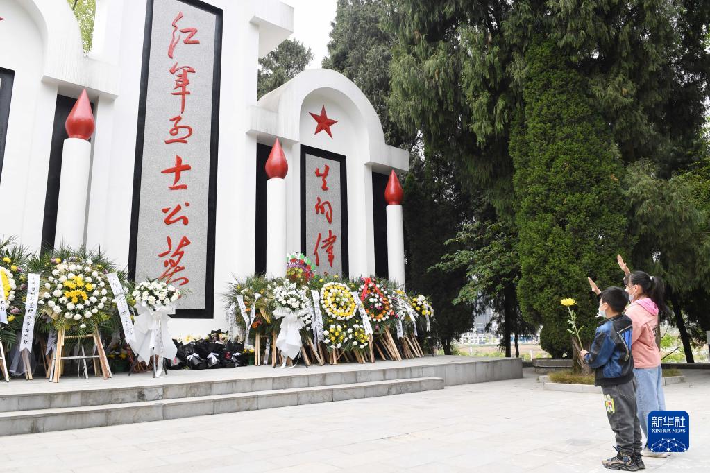 4月4日,貴州省仁懷市魯班紅軍烈士陵園紅軍烈士墓前,兩名小朋友向烈士敬少先隊隊禮。