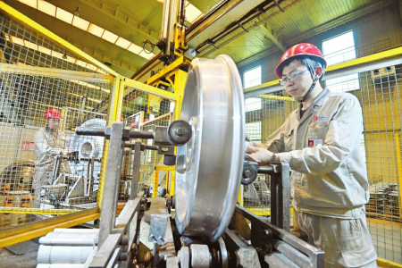 6月14日,暑氣已盛,記者走進(jìn)太原重工軌道交通設(shè)備有限公司車輪廠二線生產(chǎn)車間,只見(jiàn)一排排銀灰色車輪陳列有序,即將作為高鐵之足奔馳于世界各地,閃耀中國(guó)制造的熠熠光華。