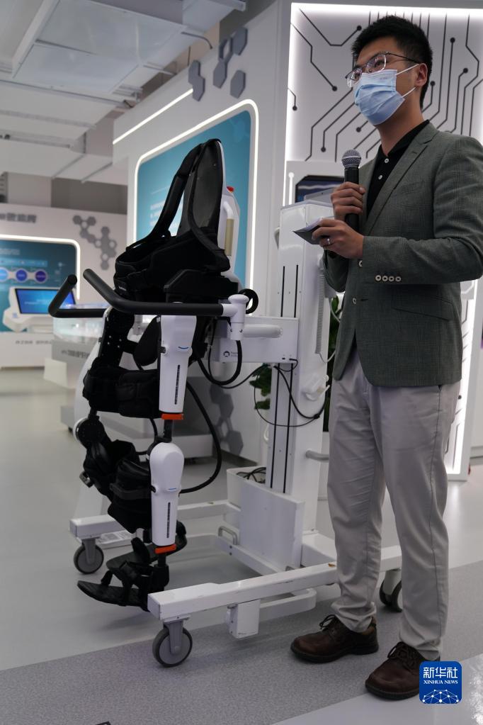 5月11日,在上海城市數(shù)字化轉(zhuǎn)型體驗館“解碼生命”區(qū)域,工作人員介紹一款下肢康復(fù)機(jī)器人。新華社記者 馬寧 攝