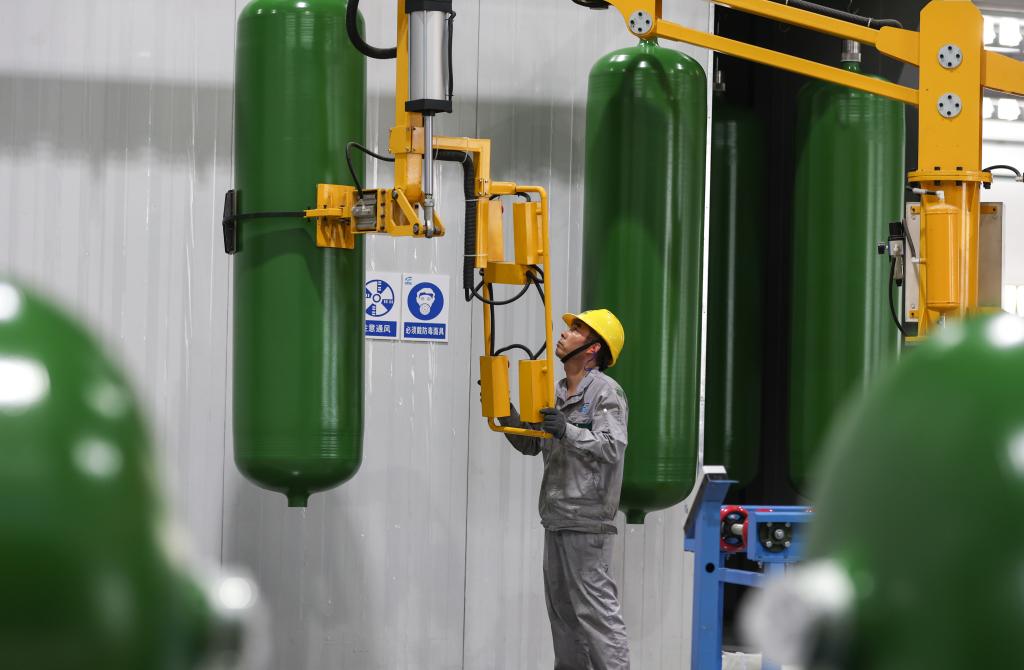 5月31日,一名工作人員在江蘇國富氫能技術裝備股份有限公司的儲氫罐生產車間內作業(yè)。新華社記者 楊磊 攝