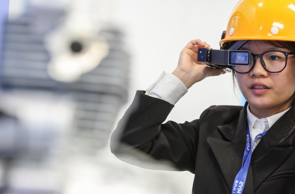 6月1日,昆山元宇宙產業(yè)園內的亮風臺(昆山)信息科技有限公司里,工作人員在演示AR智能穿戴設備賦能工業(yè)應用的場景。新華社記者 楊磊 攝