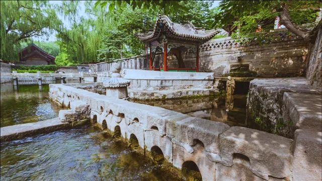 這首詩描寫的景致主要是“晉祠之水”。從詩中,我們可以發(fā)現(xiàn)晉祠之水有兩個特點。一是綠,因為水中鋪滿莎草,所以“晉祠之水如碧玉”。這景象如今前往晉祠還能看得見。二是水量充沛,能讓人“浮舟弄水”,而船上除了李白、元演,還有許多樂工歌伎,免不了還會有其他賓客,合理猜測,船定然不是一葉扁舟,起碼是游船不可。李白寫詩好夸張,形容晉祠之水為“百尺清潭”。然而他也說過“桃花潭水深千尺”,廬山瀑布“飛流直下三千尺”,說晉祠之水僅僅“百尺”,在李白詩中尚算保守。