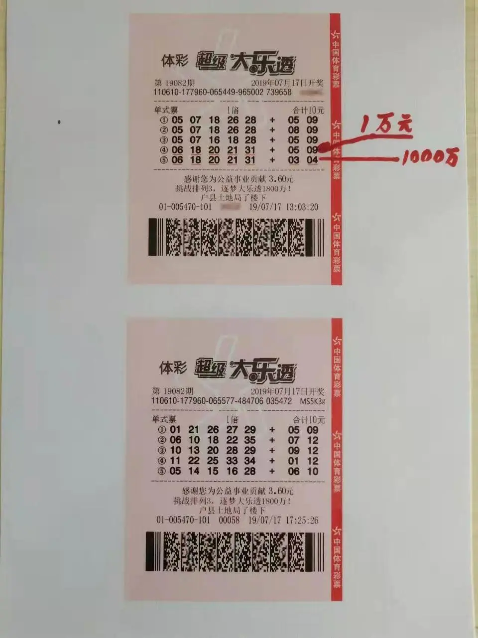 2019年7月17日,平時(shí)干送水工的姚先生閑來無事在朋友家下棋,下午5時(shí)許通過微信支付,在“好友”彩票店老板王先生處,以20元購(gòu)買了兩張?bào)w彩大樂透彩票共10注號(hào)碼。王先生將兩張彩票拍照后,通過微信發(fā)給了姚先生確認(rèn)。